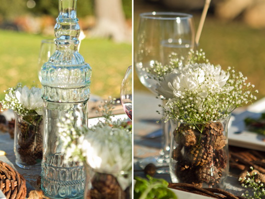 Le pigne sono l'elemento decorativo della tavola apparecchiata e compaiono sul tavolo e nei vasi, dove sono state abbinate ai fiori.
